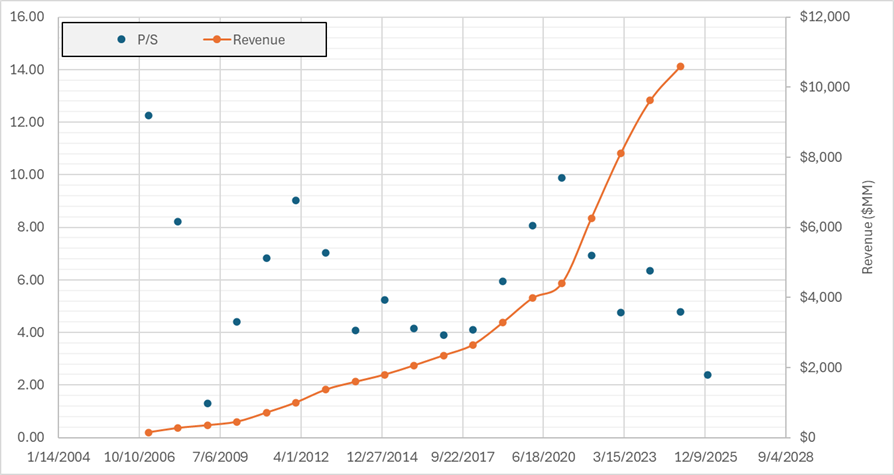 LULU Price to Sales Compared to Revenue from 2006 to 2025