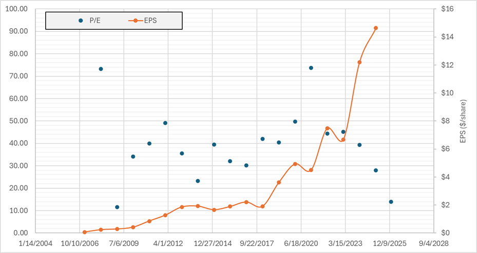 LULU Price to Earnings to EPS from 2006 to 2025